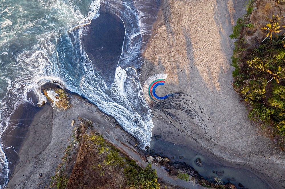 클라우스는 미국의 해양 과학자인 스카이 모레(Skye Moret) 그리고 독일의 데이터 시각화 전문가 모리츠 슈테파너(Moritz Stefaner)와 손을 잡고 작품을 선보였습니다. 이 작품은 인도네시아의 유명 관광지인 발리섬의 한 해변에 만들어졌는데요. 작품은 플라스틱 오염 문제에 대한 객관적인 데이터를 바탕으로 만들어졌으며, 이로 인해 어떤 일이 일어났는지를 시각화했습니다. 이들이 사용한 데이터는 그리 많지 않았습니다. 1950년대 초 83억 톤의 플라스틱이 생산되었으며 그중 60.1%는 버려졌으며, 6.8%만 재활용되고 있죠. 9.1%는 소각되었으며 24.1%는 아직도 사용되고 있다는 것이었습니다.