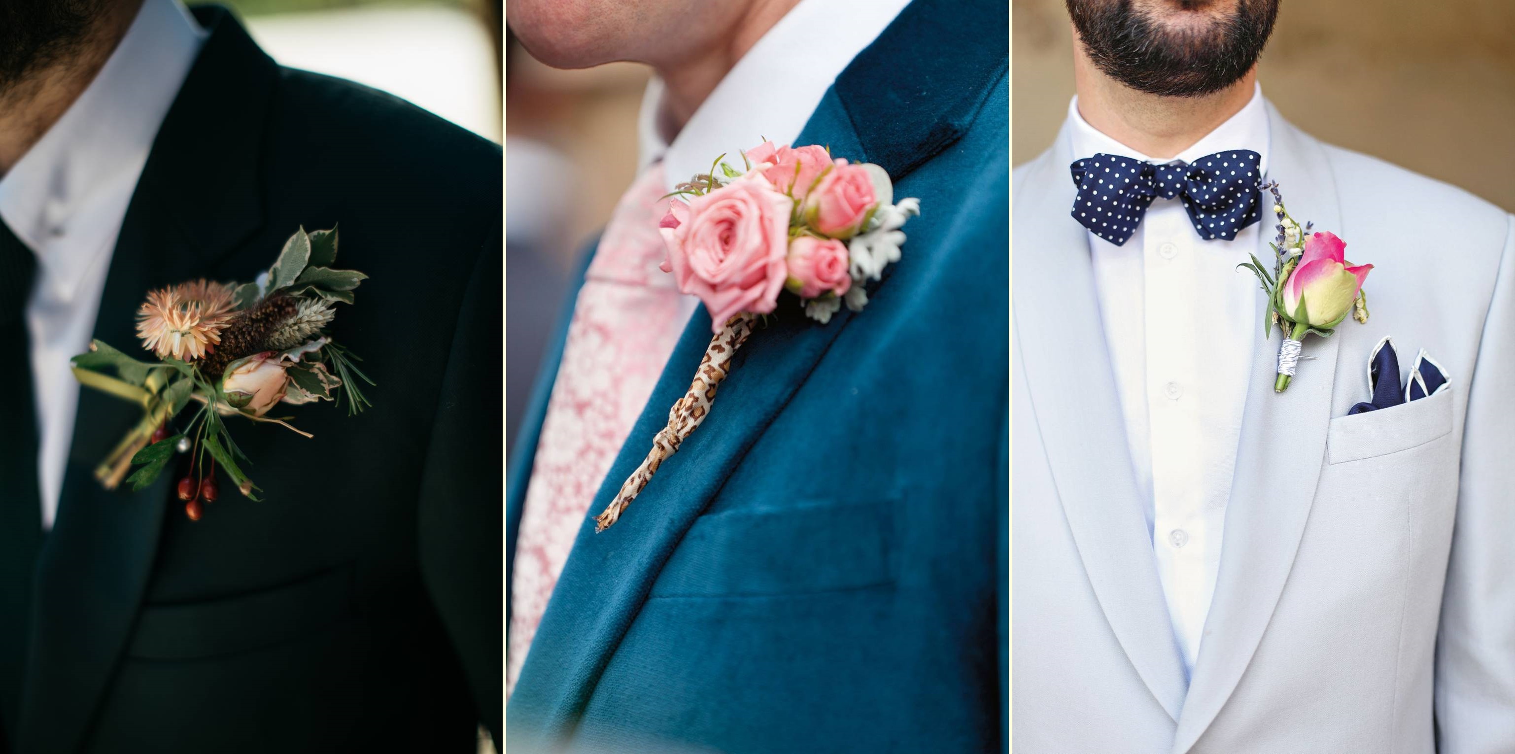 부토니아는 보통 화이트 컬러로 많이 하지만 핑크색과 같은 사랑스러운 색상도 충분히 부토니아로 사용할 수 있습니다. 달리아, 장미, 로즈메리를 사용해 만든 세련된 부토니아(좌측)부터 여러 개의 장미와 호피무늬 래핑을 더한 유니크한 부토니아(중간), 그리고 밝은 부토니아는 밝은 색생의 슈트와 잘 어울리며 더욱 화사한 느낌을 자아냅니다.