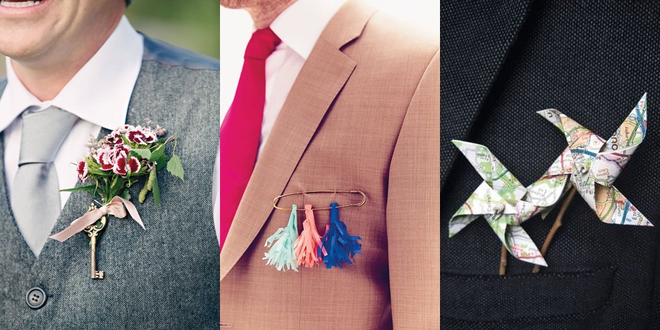 더 파격적인 부토니아도 있습니다. 빈티지한 열쇠를 달어 재미를 더할 수 있고, 꽃 대신 옷핀에 컬러풀한 장식을 달아 부토니아를 대신할 수도 있습니다. 더 파격적으로는 바람개비 장식을 직접 접어 버튼홀이나 포켓에 넣을 수도 있습니다.