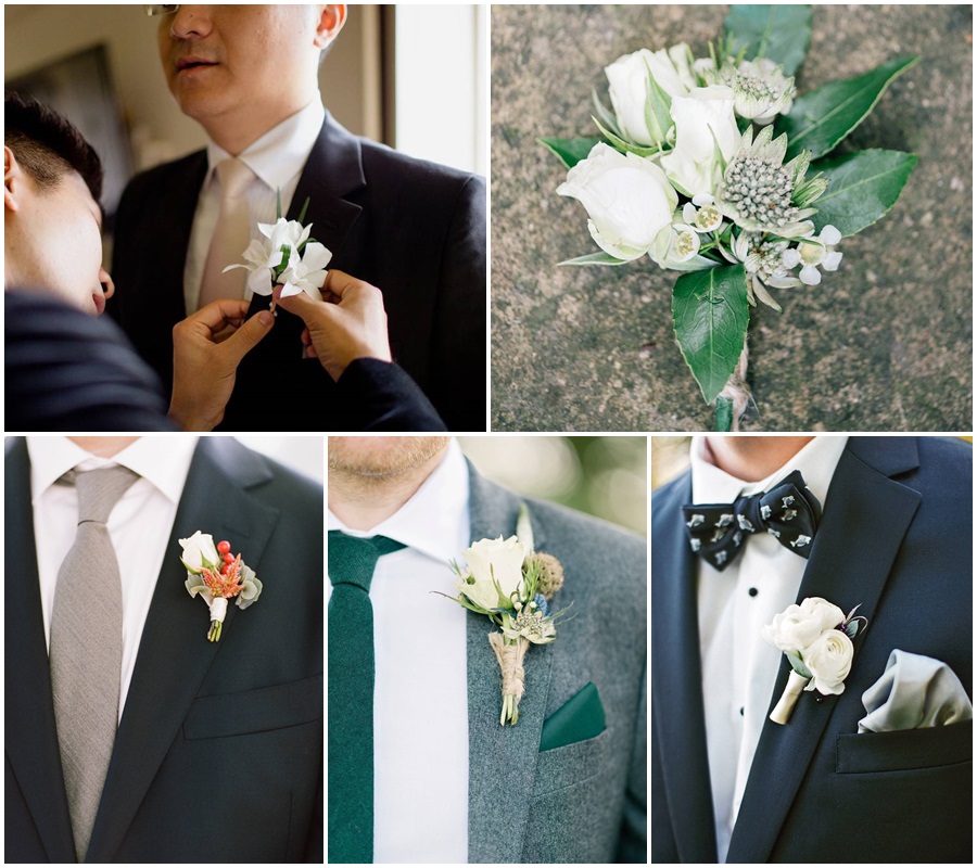 부토니아에 꼭 꽃이 주로 들어가야하는 것은 아닙니다. 꽃을 최소화하고 초록색 잎, 솔방울, 열매 등을 함께 묶어도 됩니다. 네이비 슈트에 라벤더와 로즈메리 잎으로 묶은 부토니아(하단 우측)를 매치하니 독특하면서도 매우 세련돼 보입니다.