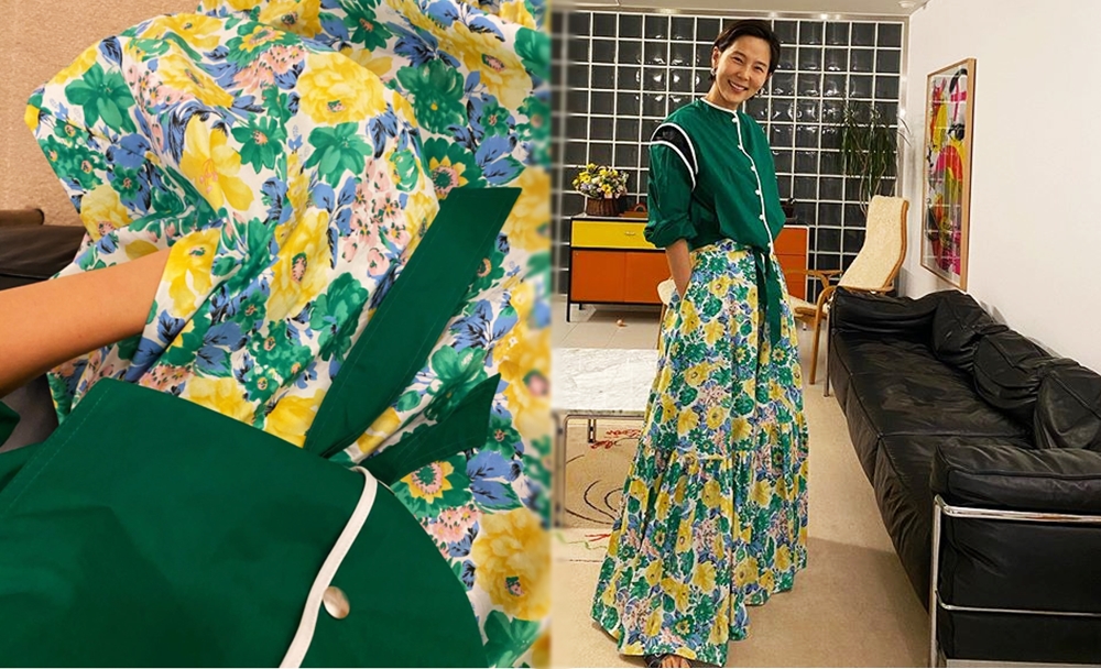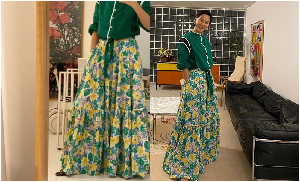 맥시 스커트 중 가장 많이 보이는 것은 아마 화려한 플로럴 패턴이 아닐까 생각됩니다. 사실 플로럴 패턴을 소화하는 것은 그리 쉽지 않아 보이지만 그리 어려운 일도 아닌데요. 김나영처럼 스커트의 색상 중 하나를 골라 상의로 입는다면 화려하면서도 정돈된 스타일링을 선보일 수 있습니다.