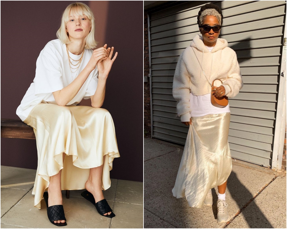 은은한 광택이 매력적인 새틴 맥시스커트는 어떨까요? 새틴 스커트를 잘못 스타일링하면 마치 잠옷 같거나 혹은 시상식에 참가하는 것처럼 너무 드레스업 된 느낌을 줄 수 있는데요. 새틴 맥시스커트를 입는다면 캐주얼한 코튼 소재 등을 매치해 편안하지만 세련된 느낌을 주는 것이 좋을 것 같네요.