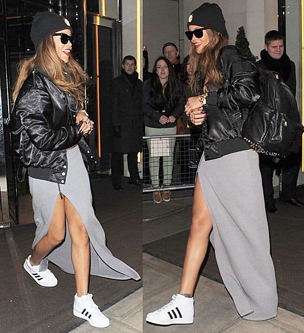 맥시스커트에 샌들이나 힐을 신는 조합도 물론 멋지지만 조금 더 힙하게 맥시스커트를 스타일링하고 싶다면 스니커즈도 좋은 선택입니다. 리한나는 긴 슬릿 디자인이 특징적인 스커트를 입고 캐주얼한 스니커즈를 매치했는데요. 편안하면서도 섹시한 느낌을 자아내고 있습니다.