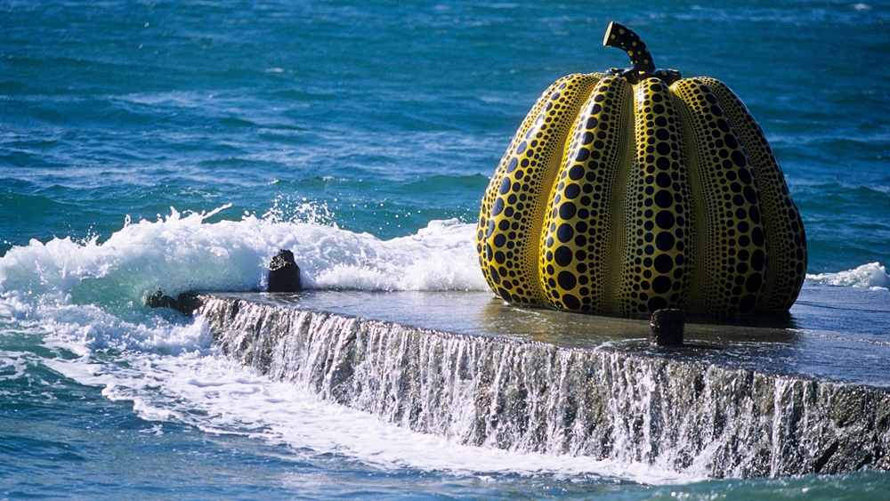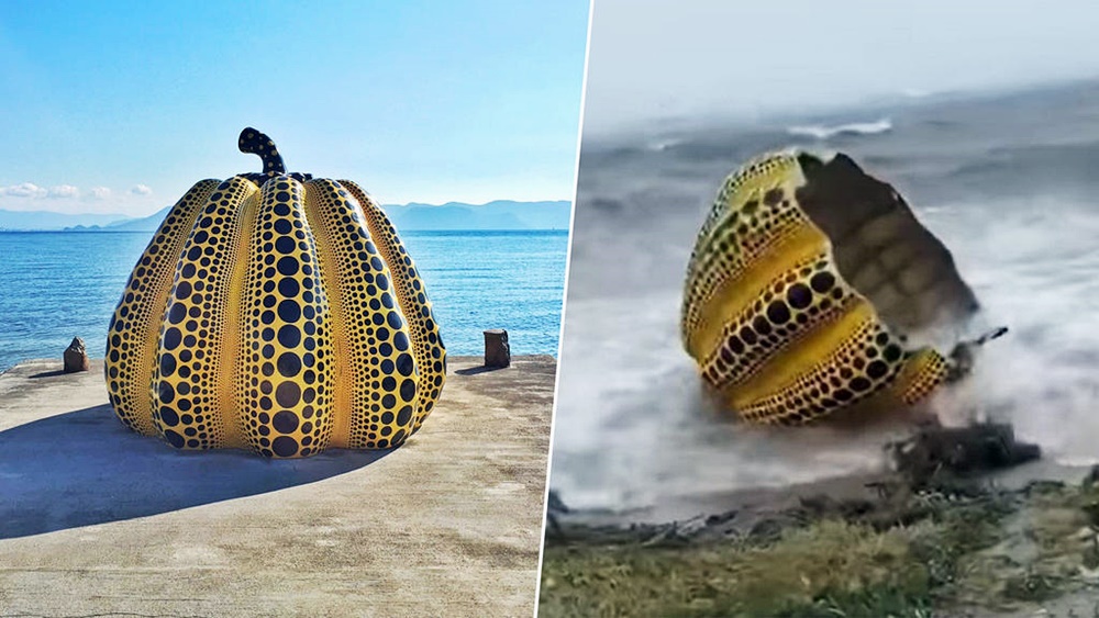 파손된 작품을 소장하고 있던 곳은 바로 일본 시코쿠 가가와현 나오시마 섬에 위치하고 있는 미술관 베네세 하우스였습니다. 베네세 하우스에서는 쿠사마 야요이의 대형 호박 조각을 해변 부두에 설치해두었는데요. 9호 태풍 루핏이 강타하며 호박이 바다로 빠진 것이었죠. 이 작품은 높이 2미터, 지름 2.5미터의 크기이며, 강화 플라스틱으로 만들어졌습니다. 원래 이 작품은 바다에 인접해 있기에 작품을 고정시키는 장치가 있는데요. 태풍으로 인해 이 장치에 문제가 생기며 작품이 바다로 빠져버린 것이죠.