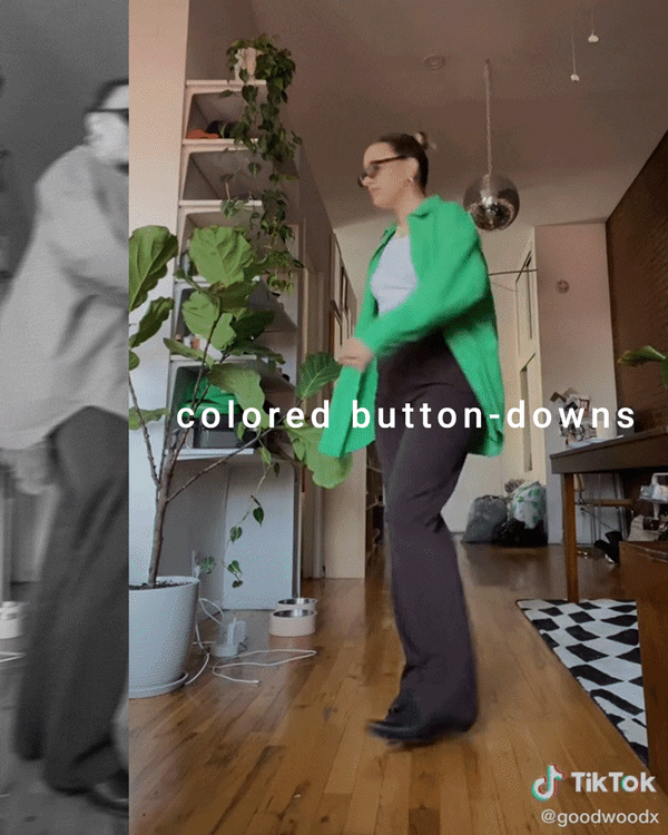 클래식하고 편안한 버튼 다운 셔츠가 첫 번째 틱톡 트렌드에 뽑혔습니다. 그러나 올해 트렌드에서 독특한 부분이 있는데요. 바로 쨍한 컬러의 셔츠가 사랑받고 있다는 것이었습니다. 가장 사랑받는 컬러는 라임 그린과 푸샤 컬러인데요. 심플한 하의와 상의를 입은 후 포인트가 되는 셔츠를 걸치고 약간의 액세서리만 더해준다면 트렌디하면서도 편안한 스타일링이 완성됩니다.