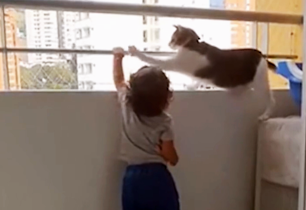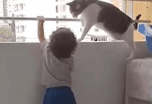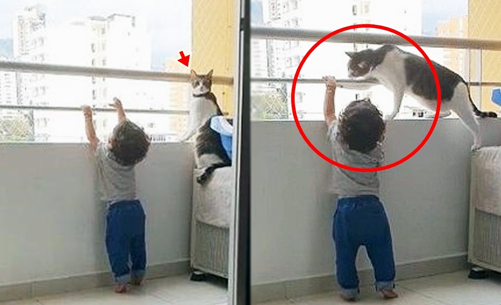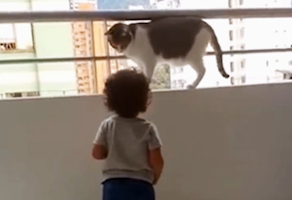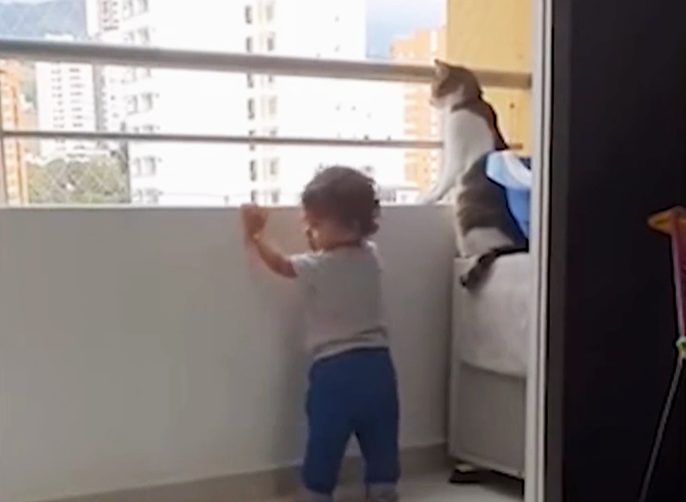 영상 속에는 아이가 있고, 아이의 옆에는 고양이 한 마리가 있습니다. 아이와 고양이가 있는 곳은 난간 앞인데요. 사실 난간은 아이의 머리까지 오는 높이이고, 뒤쪽에는 영상을 찍고 있는 보호자도 있기에 그리 위험한 상황은 아니었습니다. 아이는 난간 너머의 세상이 궁금한 듯 연신 난간으로 손을 뻗고 있는데요. 고양이는 이런 아이를 걱정하는 눈빛으로 쳐다보고 있습니다.