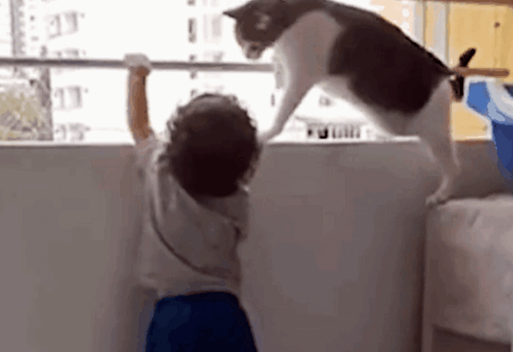조금 뒤 아이는 난간 위 봉으로 손을 뻗었습니다. 그리고 이를 지켜보던 고양이는 아이의 행동이 위험하다고 생각한 것 같은데요. 아이가 뻗은 손을 자신의 앞발로 제지했습니다. 아이는 만 1세가 조금 넘어 보이는데요. 또다시 흥분해서 난간을 향해 손을 뻗고 옹알이를 했고, 고양이는 이런 아이를 따라다니며 보호해주고 있네요. 이런 일이 몇 번을 반복되고서야 아이는 난간에서 손을 떼고 부모님께 돌아가는 것 같네요.