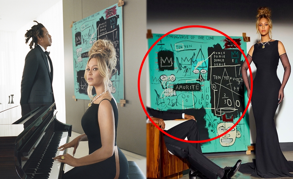티파니에서 공개된 화보에는 블랙 슈트를 입고 의자에 앉아있는 제이지와 우아한 블랙 드레스와 시스루 장갑을 낀 채 마치 여왕님같이 당당하게 서있는 비욘세의 모습이 보이는데요. 이보다 더 눈길을 끄는 것은 이들의 뒤로 서있는 대형 그림이었습니다. 이 그림은 티파니의 상징적인 색상인 민트색으로 이루어져 있는데요. 이 그림은 미국의 대표적인 그라피티 아티스트이자 팝아티스트인 장 미셸 바스키아의 작품으로 알려지며 큰 화제가 되고 있습니다.