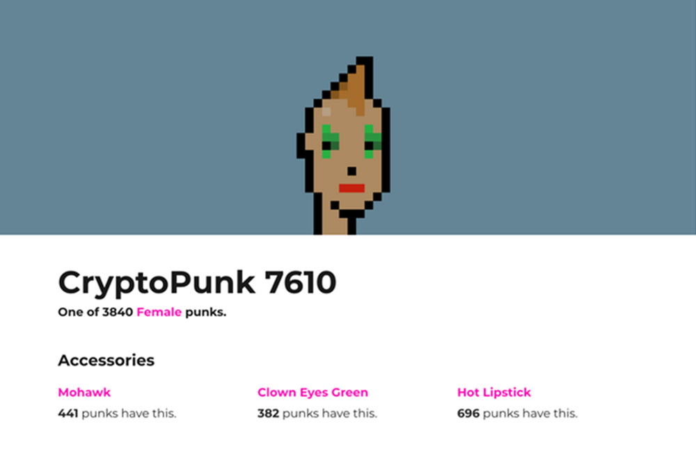 그리고 얼마 전 또 하나의 크립토펑크가 판매되며 화제가 되고 있습니다. 이번에 화제가 된 것은 바로 크립토펑크의 구매자였는데요. 글로벌 결제 기업 비자카드였습니다. 비자에서 구매한 것은 크립토펑크 7610번이었는데요. 이는 여성 이미지로 모히칸 헤어스타일을 하고 있으며 초록색 아이섀도를 하고 있는 것이 특징적입니다. 비자에서는 49.5 이더리움, 약 15만 달러(우리 돈 약 1억 7,500만 원)를 주고 이를 구매했다고 하네요.