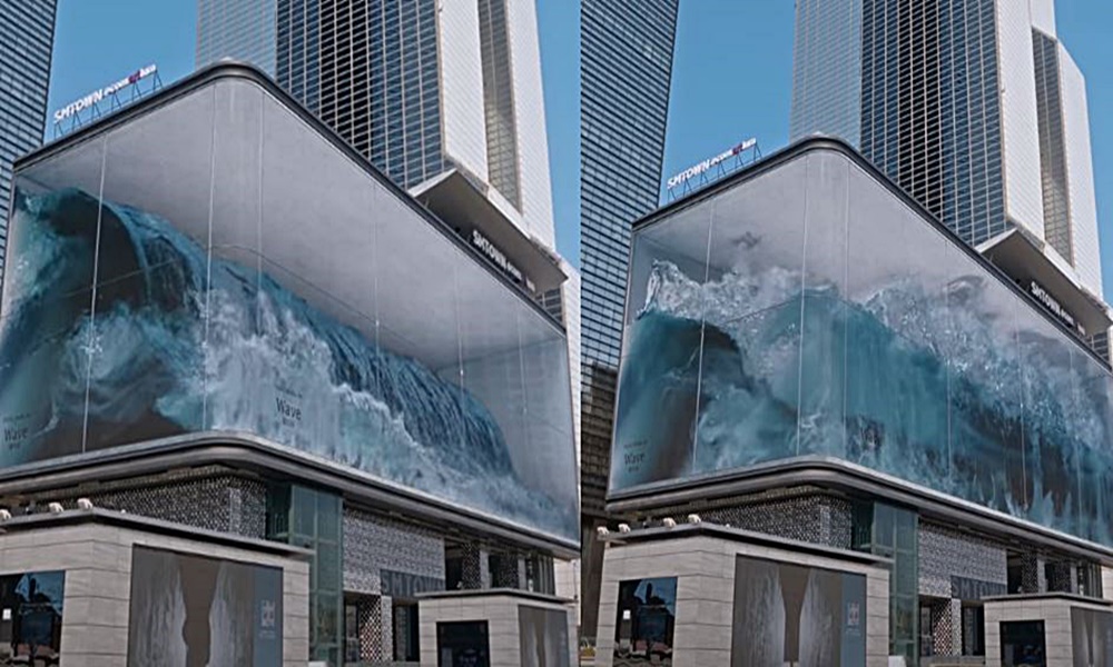한편 이런 3D 효과 영상을 선보인 것은 이번이 처음이 아닙니다. 우리나라에서도 얼마 전 화제가 된 영상이 있었는데요. 바로 지난해 4월 서울 삼성동 코엑스 K-팝 스퀘어의 LED 스크린에 끊임없이 몰아치는 입체적인 파도를 표현한 퍼밀릭 미디어아트 '웨이브(WAVE)'입니다. 웨이브는 L자 모양의 대형 LED 전광판의 특징을 최대로 활용해 스크린을 유리로 둘러 싸인 입체적 공간으로 연출하고 아나몰픽 일루전 기법을 통해 그 안에서 끊임없이 몰아치고 부딪히는 파도를 실감 나게 구현해 화제를 모았습니다.