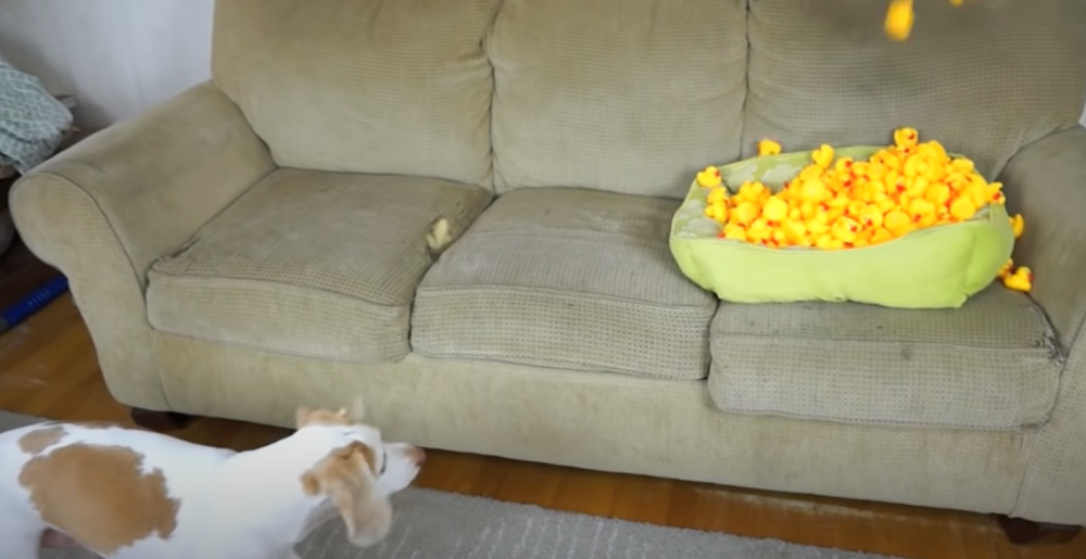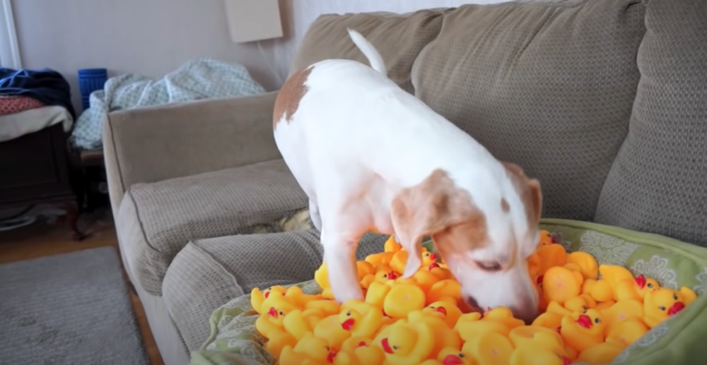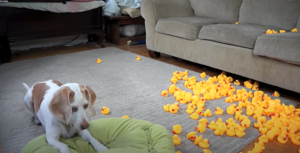 오늘 소개할 내용 또한 메이모의 주인이 메이모에게 장난을 친 것인데요. 바로 고무 오리 '러버덕'을 이용한 것이었습니다. 러버덕은 꽉 쥐면 '삑'하는 소리가 나기에 강아지들이 장난감으로 좋아하는 아이템 중의 하나이죠. 영상은 메이모에게 던져진 러버덕 한 마리로 시작되었습니다.