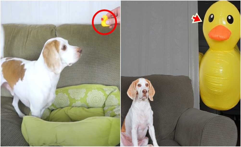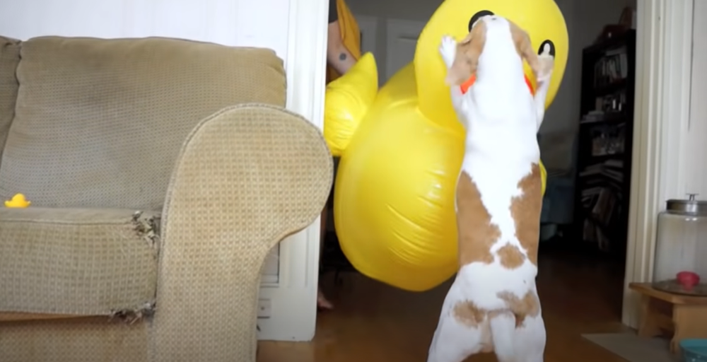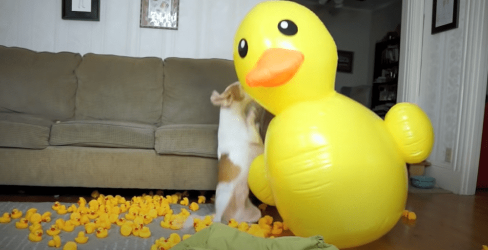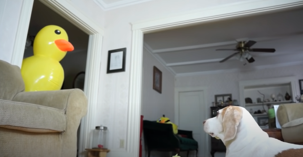 '러버덕 프로젝트'는 여기서 끝이 아니었습니다. 잠시 후 방에서는 거대한 러버덕 풍선이 나타났는데요. 메이모는 전보다 더 혼란스러운 표정을 지었습니다. 그러나 다른 강아지들과는 달리 메이모는 겁을 먹지 않았는데요. 용감하게 거대한 오리에게 다가가 공격했습니다. 또 다른 강아지 페니(Penny)가 등장해 이 광경을 봤지만 페니는 매우 충격을 받은 것 같아 보이네요.