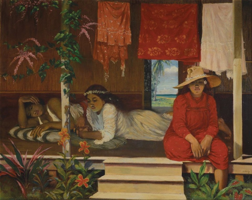 파브리스 푸르마누아르는 이 작품이 '가짜'라고 주장하고 있습니다. 그의 주장에는 카탈로그 레존네에서 빠진 것 이외에도 여러 가지 이유가 있는데요. 그는 고갱의 그림은 '원시적인 구성'을 하고 있지만 이 그림은 '전형적인 식민지 구성'이라는 것이 그 이유 중의 하나였죠. 오른쪽에 그려진 여성들의 포즈, 옷 등이 유럽의 관습에 의해 '부패된' 타히티인들을 보여준다는 것이었습니다.