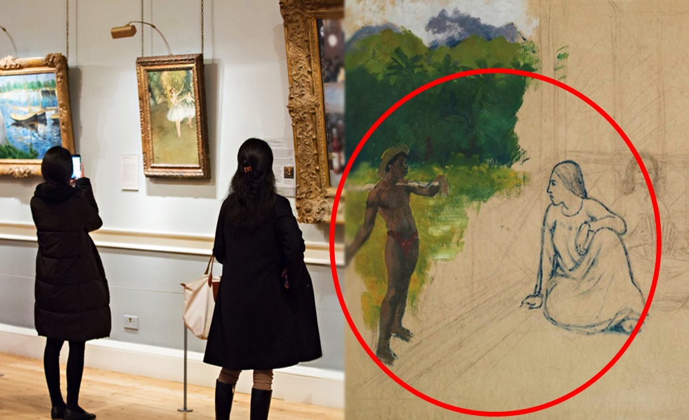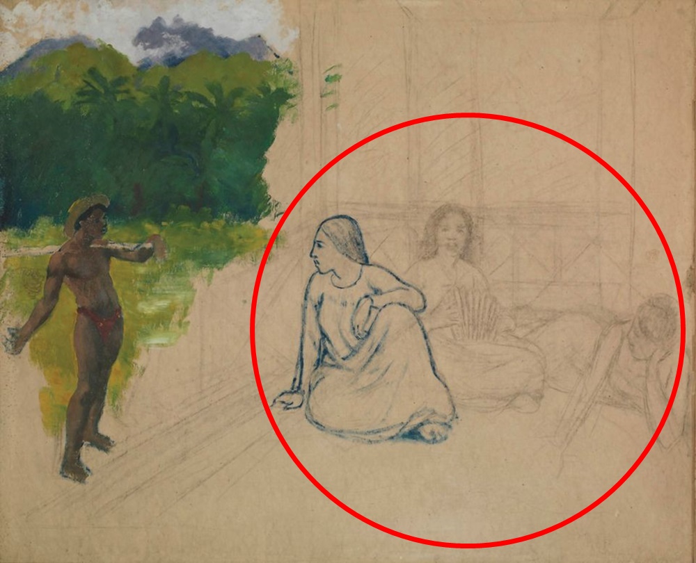 논란의 작품은 고갱의 '타히티 사람들(Tahitians)'입니다. 이 작품은 미완의 상태로 있는 그림인데요. 그림의 왼쪽에는 타히티 소년이 있고, 야자수와 산이 있는 풍경이 있으며, 오른쪽에는 세 명의 여성이 오두막 안에 있습니다. 왼쪽 부분은 유화로 그려져 있는 반면 오른쪽 여성들은 차콜로 스케치만 되어 있는 상태인데요. 이 세 명의 여성 중 한 명은 파란색 크레용으로 더욱 진하게 그려져 있습니다.
