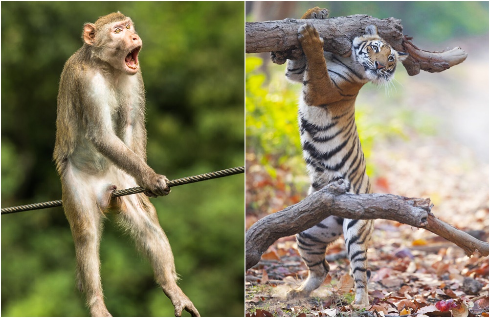 인도의 짐 코베트 국립공원에서 수년간 사진을 찍어온 작가의 작품입니다. 마치 힘이 센 호랑이가 나무를 들고 있는 것 같지만 사실 귀여운 아기 호랑이가 나무통을 이용해 얼굴을 긁고 있는 순간입니다.