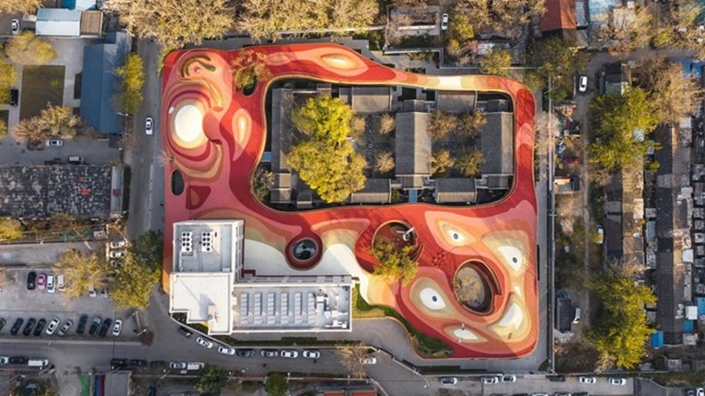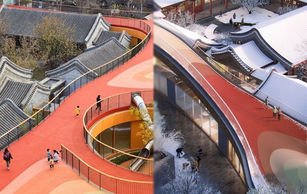 베이징의 차오양 구에 문을 연 유치원 웨청 코트야드 유치원의 모습입니다. 이 건물은 전통과 현대의 조화를 이루고 있는데요. 18세기에 지어진 기와집을 새로 만든 현대 건축물이 감싸고 있는 형태입니다. 이 유치원의 빨간 지붕은 아이들을 위한 넓은 놀이공간으로 사용되고 있으며, 미묘하게 휘어져 있는데요. 이에 아이들이 야외 스포츠와 활동을 할 수 있는 놀이터로 사용될 수 있습니다.