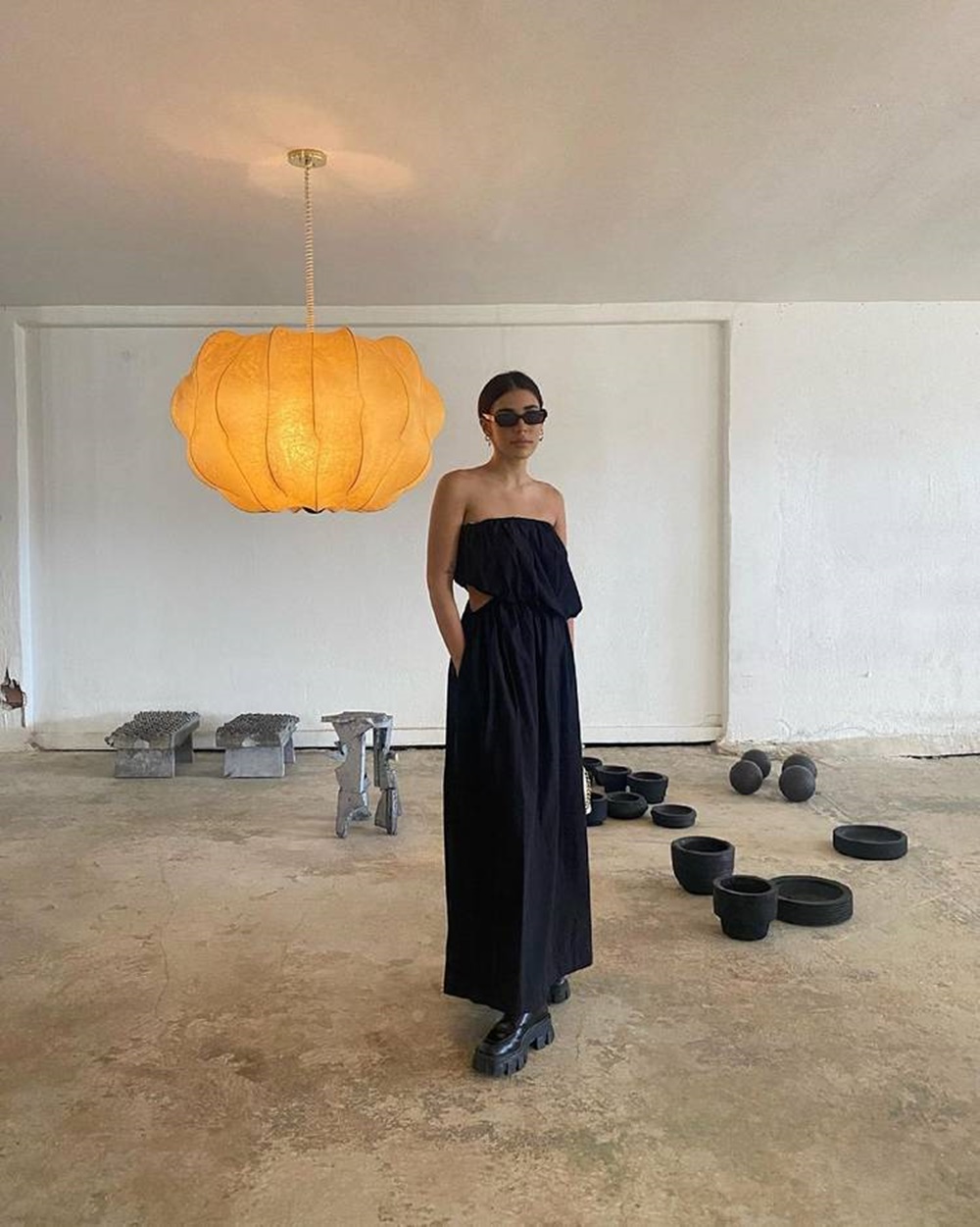 살랑살랑 여성스러운 드레스를 단숨에 바꿔주는 것은 바로 선글라스와 청키 한 부츠 덕분이 아닐까요? 여기에 볼드한 액세서리까지 더해준다면 더할 나위 없는 올블랙 패션이 될 것 같네요.
