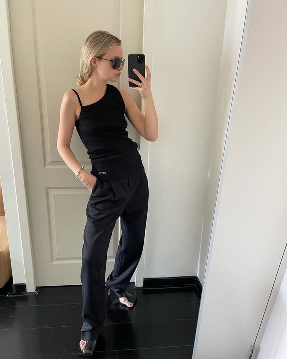 올해 유행 중인 아이템 중 하나는 테일러드 베스트입니다. 블랙 테일러드 베스트에 블랙 팬츠, 블랙 힐에 블랙백까지 모든 것을 블랙으로 맞춰 시크한 느낌을 자아내고 있습니다.