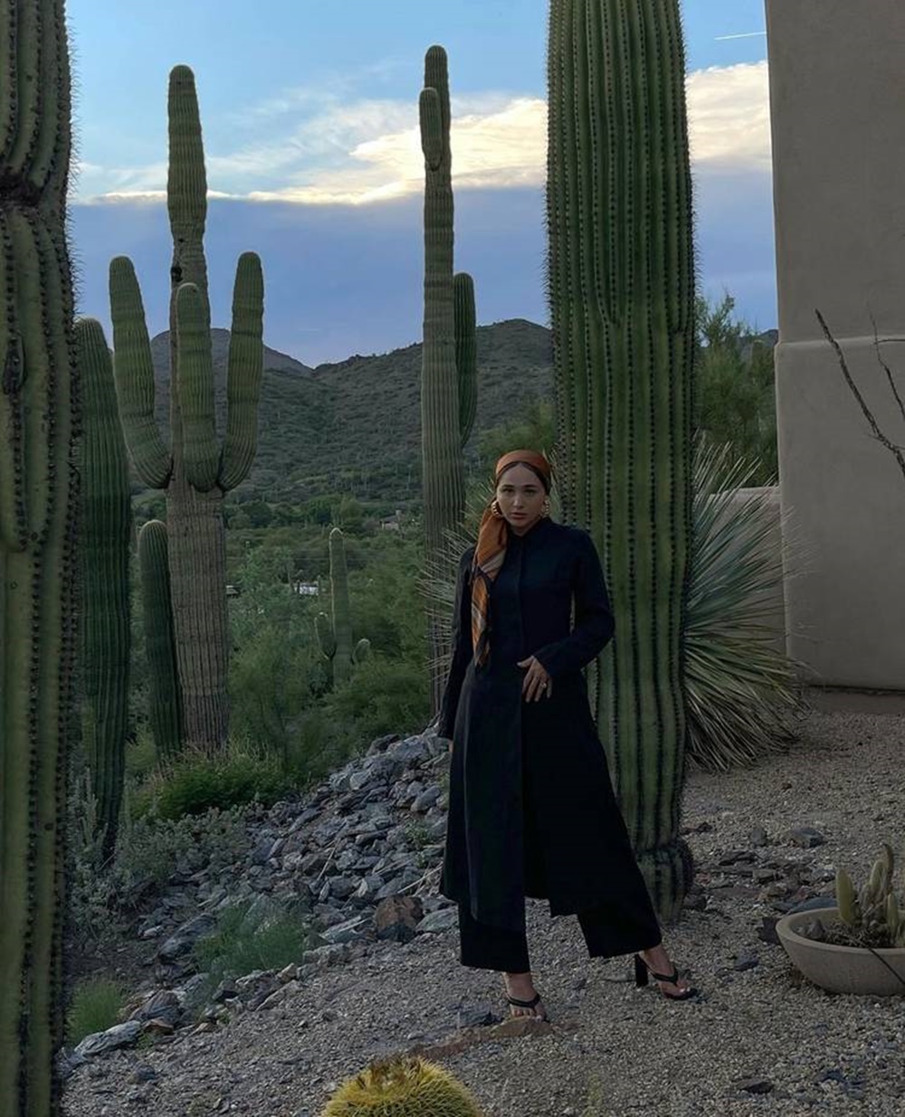 블랙 드레스를 상의처럼 입고 와이드 팬츠를 매치했습니다. 여기에 헤드 스카프로 포인트를 더했네요.