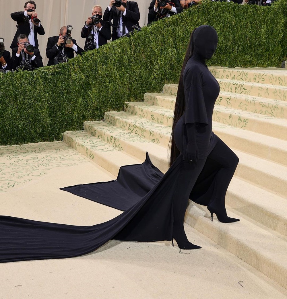 멧 갈라에서 빼놓을 수 없는 인물. 바로 킴 카다시안입니다. 킴 카다시안은 머리 끝에서 발 끝까지 블랙 컬러의 의상으로 뒤덮여있는데요. 올블랙 점프슈트에 티셔츠 드레스, 그리고 얼굴을 모두 덮는 복면까지 착용해 눈길을 끌고 있습니다. 이 복면은 발렌시아가의 크리에이티브 디렉터 뎀나 바질리아가 디자인한 것이라고 하네요. 이 의상은 얼굴을 완전히 가리고 있는 것이기에 많은 사람들이 킴 카다시안을 알아보지 못할 것이라 예상했지만 그녀의 특징적인 몸매 덕분에 누구나 킴 카다시안이라는 것을 알아봤다는 후문입니다.