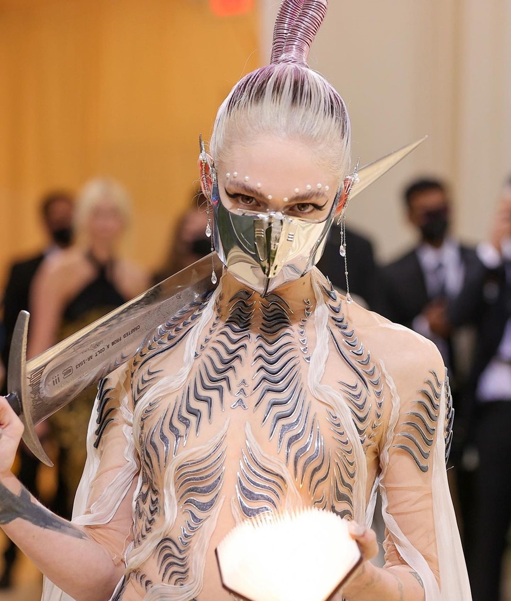 캐나다 출신의 아티스트이자 현재는 세계 최고 부자 중 한 명인 일론 머스크의 여자친구로도 유명한 그라임스도 멧 갈라에 참석했습니다. 그라임스는 평소에도 독특한 스타일링으로 대중적인 것과는 거리가 먼 인물인데요. 이번 멧 갈라에서도 독특한 모습으로 등장해 많은 사람들의 시선을 사로잡았죠. 그라임스가 입은 의상은 아이리스 반 헤르펜이 디자인한 것인데요. 컬트 영화에서 나온 것 같은 디자인이 특징적입니다.