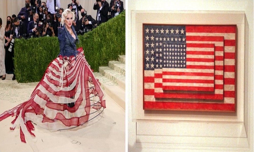 잭 포즌이 디자인한 성조기 콘셉트의 드레스를 입고 등장한 데비 해리입니다. 드레스의 색감과 구성이 재스퍼 존스의 1958년 작 <세 개의 국기>에서 영감을 받은 것이 아닐까 생각됩니다.