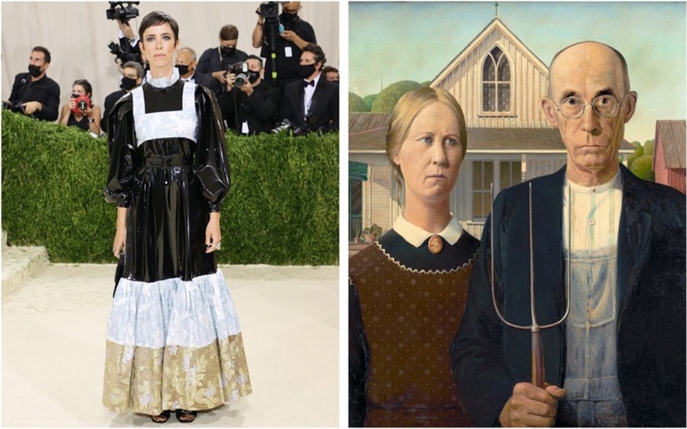 멧 갈라에 등장한 영화배우 레베카 홀의 모습입니다. 레베카 홀은 바체바(Batsheva)가 디자인한 피나포어 스타일의 드레스를 입고 등장했습니다. 그녀의 패션은 1930년에 제작된 그랜트 우드의 <아메리칸 고딕>을 떠올리게 하는데요. 화이트 칼라와 무표정한 그녀의 얼굴이 그림과 더욱 닮은 것 같습니다.