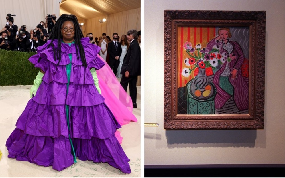 우피 골드버그는 발레티노의 디자이너 피에르 파올로 피치올리가 디자인한 바이올렛 컬러의 러플 가운을 입고 등장했습니다. 이 드레스는 마치 앙리 마티스의 <보라색 드레스와 아네모네> 작품에 등장한 여인이 입고 있는 의상을 떠올리게 합니다. 겉에는 보라색, 안쪽은 그린 컬러가 돋보이는 의상입니다.