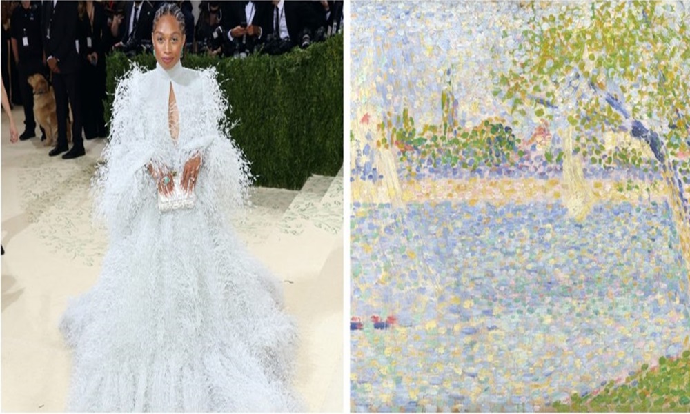 24만 개의 타조 깃털을 사용해 만든 드레스를 입은 앨리슨 펠릭스입니다. 앨리슨 펠릭스는 육상선수로 도쿄 올림픽 육상 여자 400미터에서 동메달을 땄으며, 여자 4X400미터 계주에서는 금메달을 딴 선수이죠. 앨리슨 펠릭스의 드레스는 펜디에서 만든 것인데요. 마치 주르주 쉬라의 점묘법을 떠올리게 합니다.