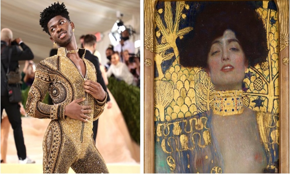 래퍼이자 싱어송라이터인 릴나스엑스는 도나텔라 베르사체의 앙상블을 입고 등장했습니다. 이 의상은 반짝이는 소재의 보디 슈트였는데요. 많은 사람들이 이 의상을 보고 '황금빛의 화가' 구스타프 클림트를 떠올리지 않았을까 생각됩니다.