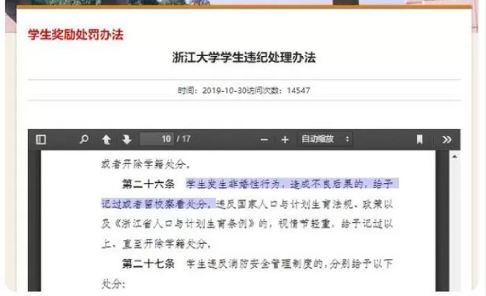 가장 먼저 화제가 된 것은 다롄이공대 대학원이었습니다. 이곳에는 '학습 기간 발생한 미혼 성 행위자는 경고 이상을 처분한다'는 규정이 있다고 하네요. 즉 학기 중에 결혼을 하지 않고 성관계를 가지면 징계를 받는다는 것이죠. 이뿐만이 아닙니다. 저장대학교에서는 '미혼인 학생이 성행위를 저질러 좋지 않은 결과가 발생하면 경고 혹은 교내 관찰 처분에 처한다'라고 규정하고 있습니다. 성관계를 가지는 것은 괜찮지만 이로 인해 불미스러운 사건이 발생하지 않아야 한다는 것이죠.
