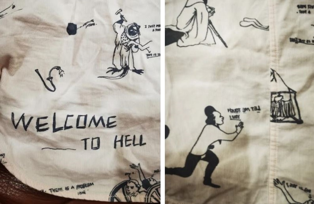 A씨가 올린 사진 속 티셔츠에는 영어로 뭔가가 써져 있었습니다. 그중 문제가 된 것은 몇몇 문구였는데요. 'Welcome to hell' 'Let me touch you' 등이 있었습니다. 이 문구는 '지옥에 온 걸 환영한다' '내가 좀 만져줄게'라는 뜻이었는데요. A씨는 도대체 누가 지옥에 가는 것이며, 소아성애자나 할 법한 문구라며 분노하고 있습니다.