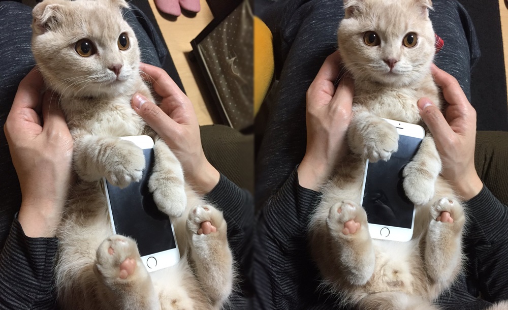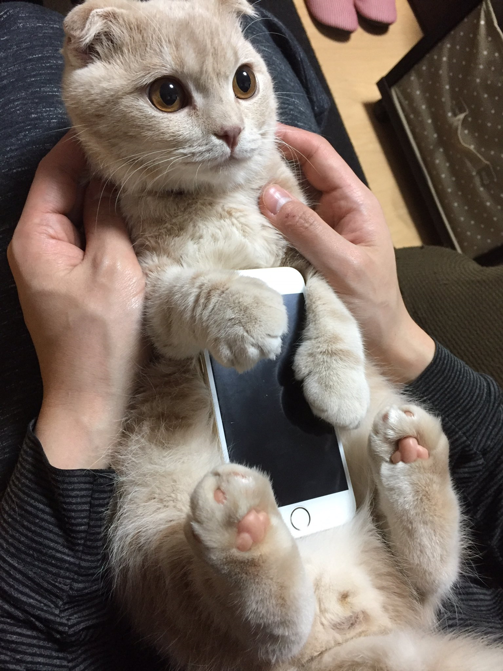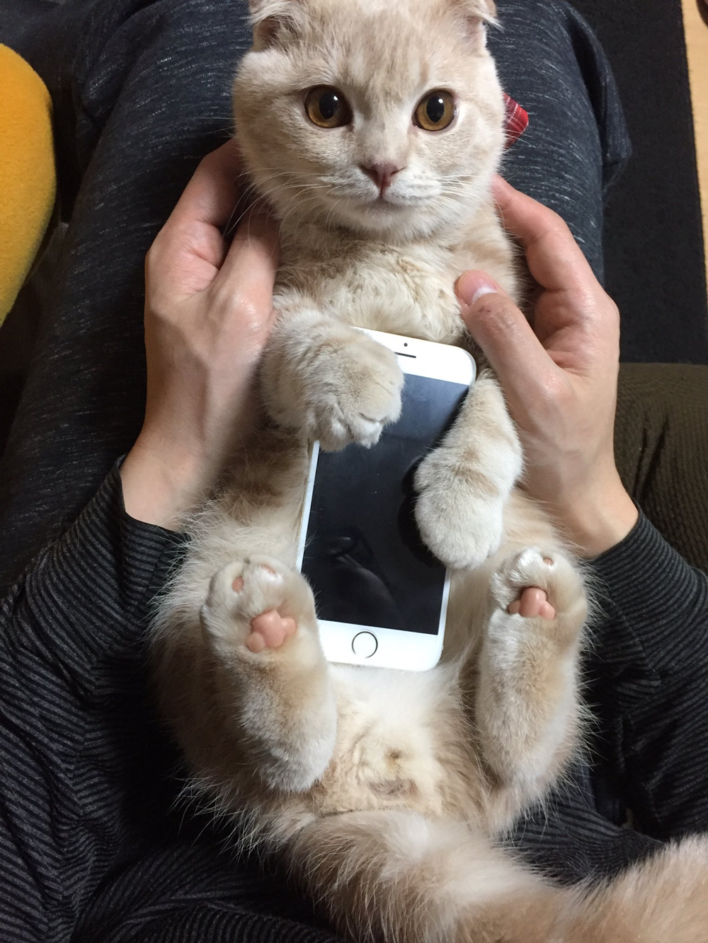 사진 속에는 마치 인형처럼 귀여운 고양이가 아이폰을 앞발로 꽉 쥐고 있는데요. 이 네티즌은 '새로운 아이폰 케이스'라는 재치 있는 코멘트를 달았네요.