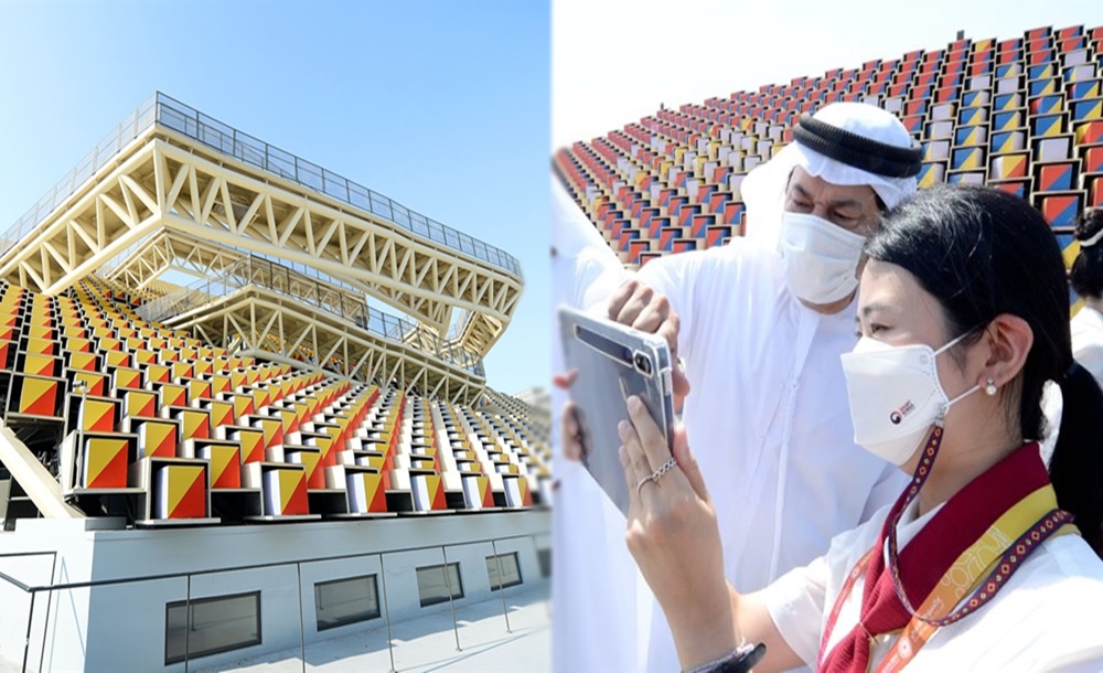 한국관은 191개 참가국 중 다섯 번째로 큰 국가 전시관을 마련했습니다. 한국관의 외벽은 1,597개의 스킨 큐브로 되어 있으며, 한국관의 디자인은 2002년 월드컵 거리 응원과 대규모 공연장에서 이뤄지는 '떼창'에서 볼 수 있는 역동성과 흥에서 영감을 받아 만들어진 것입니다. 지상층에는 '마당'이라는 공간이 있는데요. 이곳에서는 K팝, 비보이 등의 공연이 열리고 있습니다.