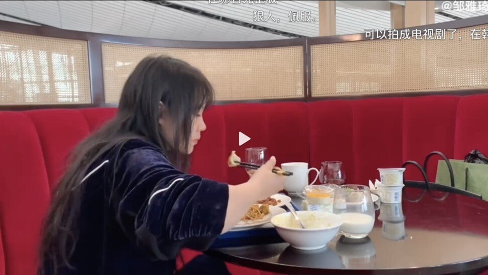 해당 인물은 베이징의 중앙 미술원에 재학 중인 주야치(Zou Yaqi)입니다. 주씨는 지난 9월 자신의 웨이보 계정에 영상을 몇 개 올렸는데요. 영상 속에서 주씨는 특급 호텔 소파에서 잠을 자고, 쇼핑몰에서 무료 시식 음식을 먹었으며, 공항에서 샤워를 했으며, 심지어 경매장에서 무료 와인과 스낵을 즐기며 값비싼 장식을 팔에 걸어보기도 했습니다. 주씨는 심지어 공항에서 일등석 승객들만 들어갈 수 있는 라운지에 들어가 공짜로 음식을 먹기까지 했는데요. 주씨는 자신이 이런 방식으로 21일 동안 돈을 쓰지 않고 살았다고 밝혔습니다.