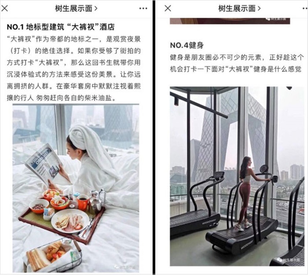 고급 호텔도 이들의 타깃 중 하나입니다. 이들은 6명이 돈을 모아 비싼 2인 티세트를 시키고 2인 1조로 짝을 지어 3개 팀이 나누어 차례대로 입장하죠. 이에 오후에 한가롭게 차를 마시는 모습을 사진으로 남깁니다. 또한 40명이 돈을 모아 하루 숙박비가 5,000위안에 달하는 호텔 객실도 빌리는데요. 이들은 사계절 옷을 싸들고 가서 호텔에서 사진을 찍은 후 SNS에 업로드합니다. 심지어 이들은 명품 스타킹도 공유한다고 하네요.