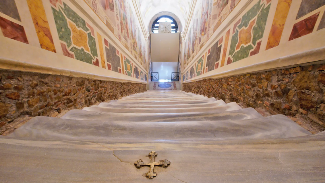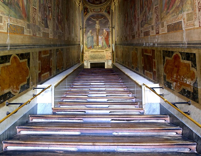 스칼라 상타(Scala Sancta)라는 이름을 가진 이 계단은 총 28개의 계단으로 이루어져 있으며 예수가 십자가에 못 박혀 사형되던 날 예루살렘의 총독 빌라도에게 가면서 밟았던 총독 관저의 계단이라고 전해집니다. 예수의 피가 떨어진 곳으로 알려진 이 계단은 기독교인들에게 신앙의 자유를 처음 허용한 콘스탄티누스 대제의 어머니인 헬레나 성녀가 기독교로 개종한 뒤 로마로 가져왔으며 이후 많은 1000년 이상을 순례객을 맞이했다고 전해집니다. 이후 1723년 교황은 이 계단을 마모로부터 보호하기 위해 나무덮개를 씌웠으며 이후 이 계단의 '속살'은 밖으로 드러나지 않았습니다.