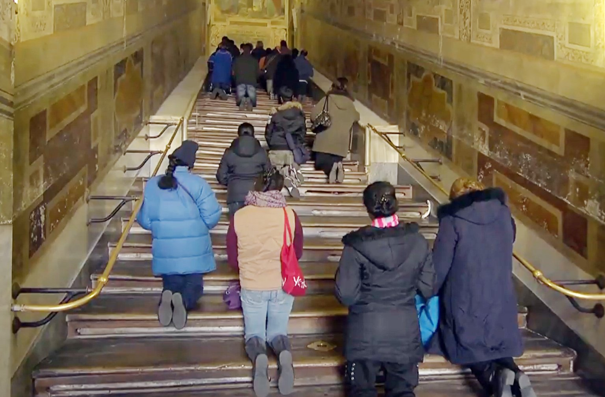 이 계단은 두 발로 걸어서 올라가는 곳이 아닙니다. 예수의 고난이 서린 이 계단은 발이 아닌 무릎과 손으로 올라가야 합니다. 이제 나무 덮개가 아닌 계단 그대로의 '대리석' 위를 무릎으로 올라가며 예수의 고난을 느낄 수 있을 것으로 보입니다.