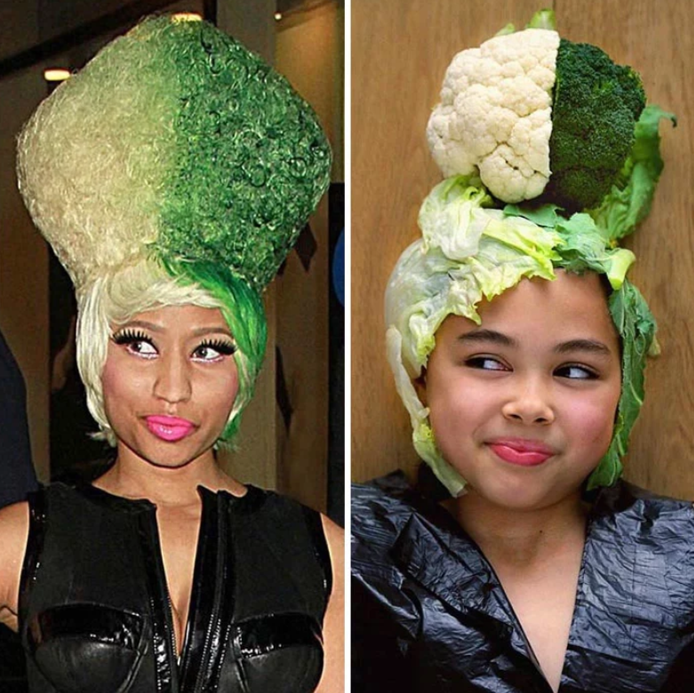 먼저 난해한 패션의 아이콘 니키 미나즈입니다. 양상추와 브로콜리, 콜리플라워를 사용하여 꽤나 흡사하게 표현했네요.