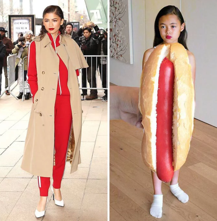 할리우드의 패셔니스타 샛별, 젠다야입니다. 빨간색 트레이닝복에 흰 스틸레토힐, 그리고 트렌치 베스트를 걸친 모습입니다. 라일리는 이 색깔의 조합을 놓치지 않았네요. 핫도그 번 사이에 빨간색 소시지를 끼워 젠다야 룩을 완성했습니다.