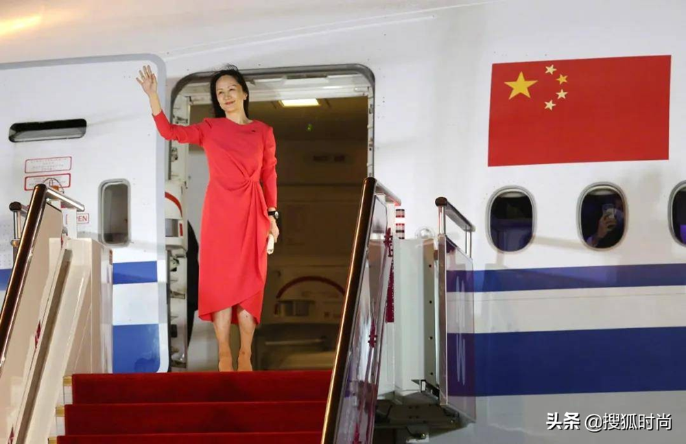 먼저 멍완저우의 귀국 패션입니다. 멍완저우는 '차이나 레드'라고 불리는 붉은 드레스를 입고 오성홍기 옆에 서서 손을 흔들고 있습니다. 이 드레스는 미국 디자이너 브랜드인 캐롤리나 헤레라의 제품이라고 하는데요. 이 제품은 약 270만 원 정도에 구매할 수 있습니다. 멍완저우는 의도적으로 붉은 드레스를 선택했다는 평가를 받고 있는데요. 바로 중국의 문화와 국기를 상징하는 색상이기 때문입니다.