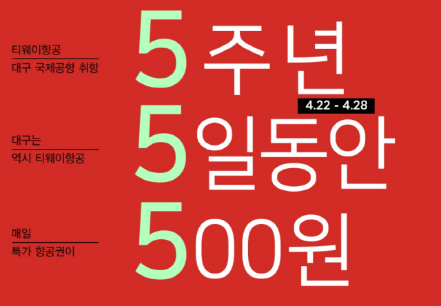 ▣ 티웨이항공 '대구 국제공항 취항 5주년 기념 500원 특가'