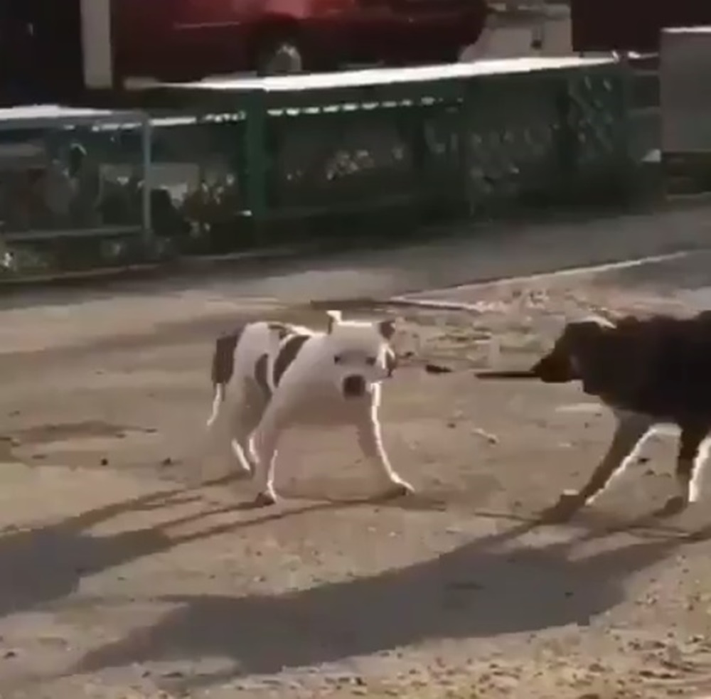 영상 속에는 흰색 핏불 한 마리가 펜스에 줄이 묶인 채 앉아 있습니다. 그리고 짙은 털 빛을 지닌 강아지가 이 줄을 풀어주려 노력하고 있네요. 이 강아지는 줄을 입으로 물고 매듭을 이리저리 풀고 있습니다. 아마 펜스에 묶인 강아지가 곤경에 처했다고 생각한 것이었죠.