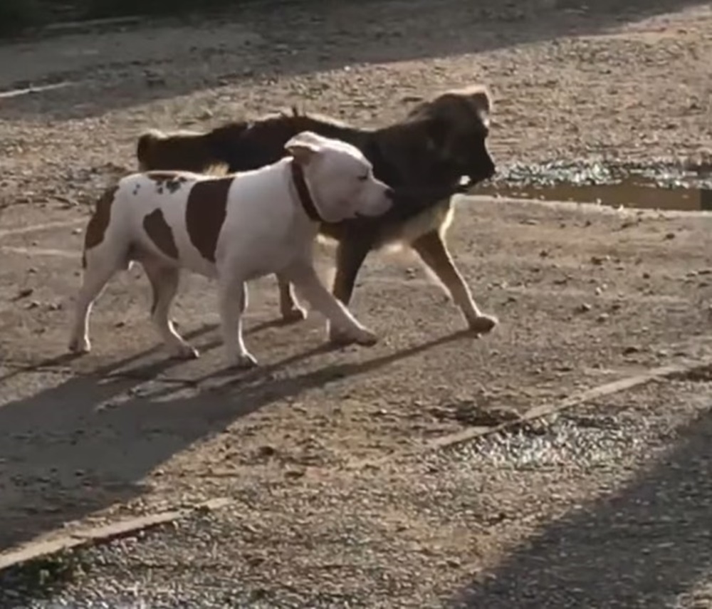 결국 이 강아지는 줄을 풀었습니다. 그리고 줄을 입으로 물고 흰색 핏불에게 도망가자는 신호를 보내고 있는데요. 어쩐지 이 핏불은 이 자리를 떠나기를 주저합니다. 그리고 마지못해 함께 길을 떠나는 것 같습니다.