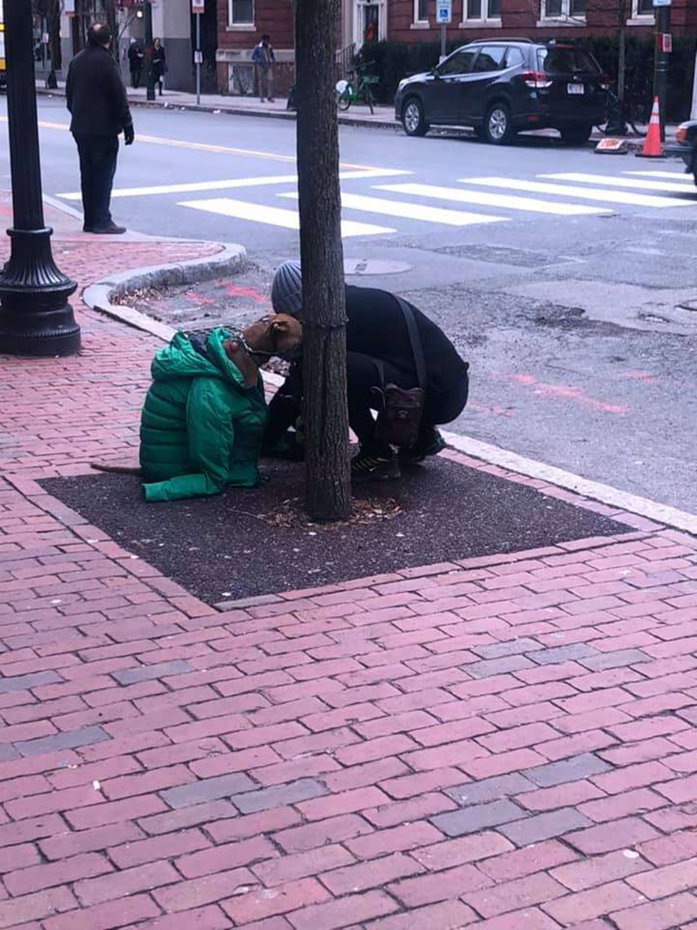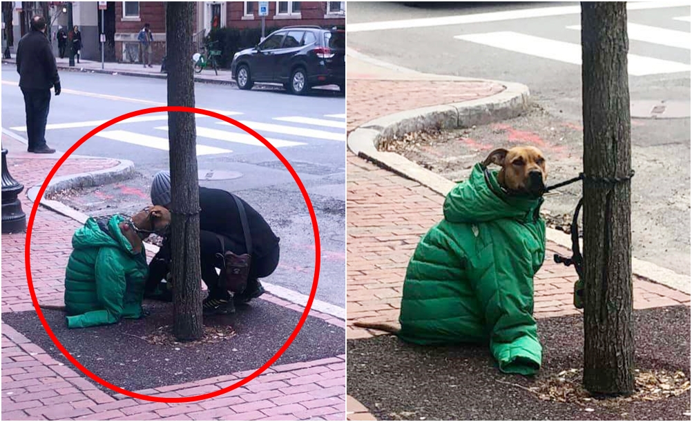 이날은 매우 날씨가 추웠는데요. 이 추운 날씨에서 밖에 있어야 하는 강아지를 위해 강아지의 주인은 기꺼이 자신의 초록색 패딩을 벗었습니다. 그리고 허리를 굽혀 강아지의 몸에 두른 패딩의 지퍼를 채웠습니다. 엄마가 패딩을 둘러줬을 때 강아지는 따뜻하고 아늑한 옷을 입고 있다는 사실에 떨고 있는 몸을 진정시켰는데요. 이에 가만히 앉아 주위를 여유롭게 쳐다봤습니다.