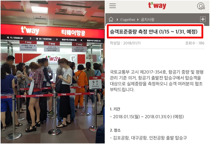 몸무게 측정은 외국의 일만이 아닙니다. 얼마 전 우리나라의 항공사인 티웨이, 제주항공 등에서도 몸무게를 측정한다는 공지사항을 띄운 후 인터넷에서는 이에 대한 예매자들의 불만이 가득 찼었는데요. 이는 추가 요금 징수, 과체중자의 탑승 거부, 혹은 좌석 배정 등의 이유가 아니라 '항공기 중량 및 평형 관리 기준'에 의거하여 승객들의 성별, 나이에 따른 표준 중량을 산정하기 위함입니다. 몸무게 측정을 원하지 않으면 거부할 수 있으며 이름, 주민번호 같은 민감한 개인 정보는 저장되지 않습니다. 이는 전 항공사에서 최소 5년에 한 번 실시하고 있습니다.