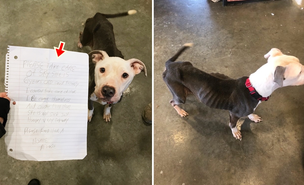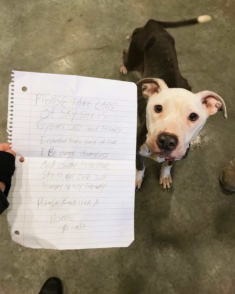 "스카이를 돌봐주세요. 스카이는 6살이고 매우 다정한 성격이에요. 저는 더 이상 스카이를 키울 수 없어요. 저는 노숙자가 되었고, 스카이를 먹일 수 없게 되었어요. 스카이에게 아픈 곳은 없고 단지 배고플 뿐이에요. 제발 스카이에게 새로운 가정을 찾아주세요"