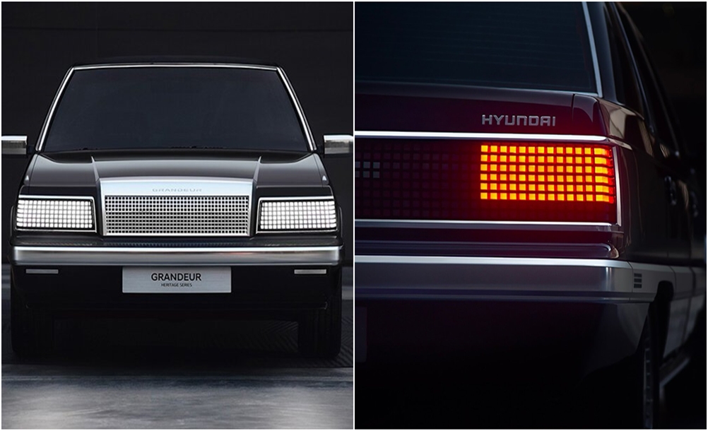 먼저 현대차에서는 1986년에 출시한 각그랜저의 직선형 디자인을 유지하고 있습니다. 그리고 여기에 픽셀 LED 헤드라이트 및 후미등을 장착해 이 '각'의 테마를 반복하고 있네요. 또한 여기에 크롬 메시 그릴과 트림, 플랫 휠 커버가 눈에 띄네요.