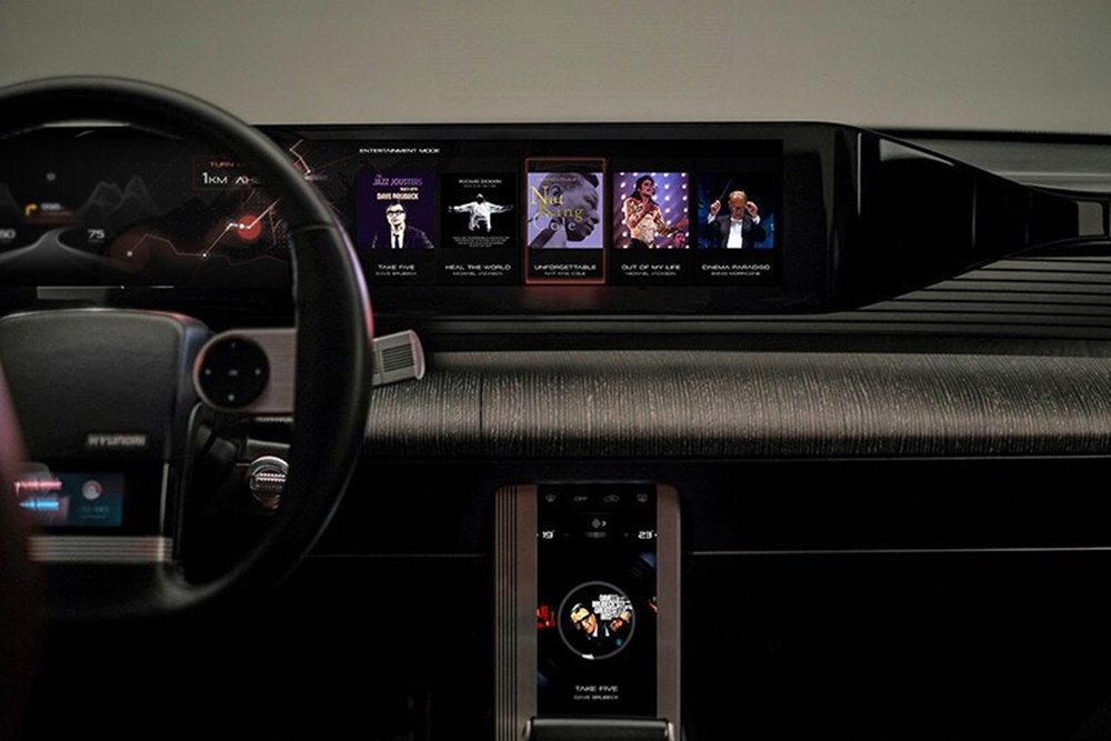 실내는 완전히 바뀌었습니다. 운전석의 앞에는 와이드스크린 디스플레이와 사운드바가 설치되었고, 다양한 멀티미디어와 운전 기능 그리고 에어컨 히터 등을 조절하는 컨트롤 패널이 장착되어 있죠. 사운드바는 18개의 스피커 사운드 시스템과 함께 작동되는데요. 현대차 측에서는 '콘서트장과 비슷한 음향'을 구현할 수 있다고 설명하고 있습니다.
