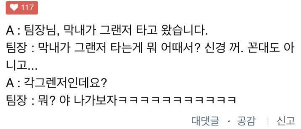 얼마 전 커뮤니티에 돌던 에피소드입니다. 네티즌들은 '아 각그랜저는 못 참지' '각그랜저 나왔으면 사장님까지 뛰어나왔다' '어디서 구했을까' 등의 반응을 쏟아냈는데요.